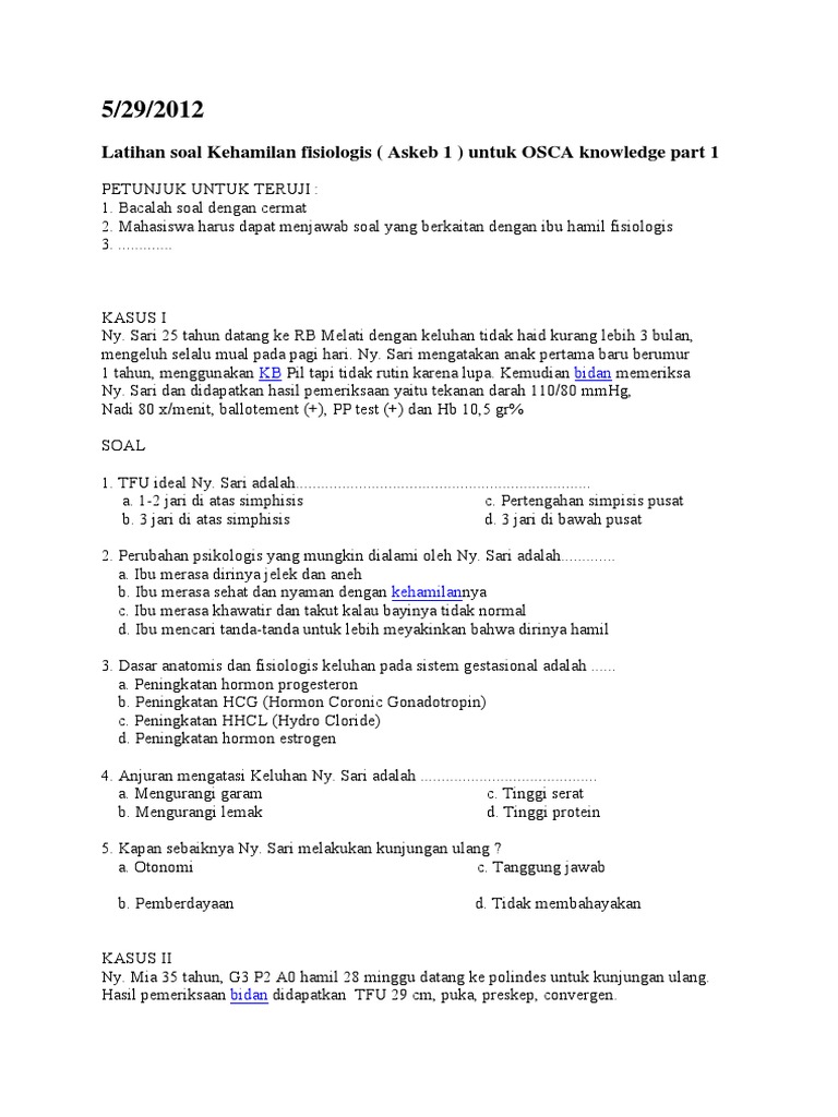 Diketahui seorang ibu hamil pertama datang ke bidan Shofi pada tanggal 20 Mei 2011 jam 0900 Wib. Contoh kasus soal perubahan fisiologis pada masa nifas. Latihan soal komunitas askeb v untuk osca knowledge mahasiswa harus dapat menjawab soal.