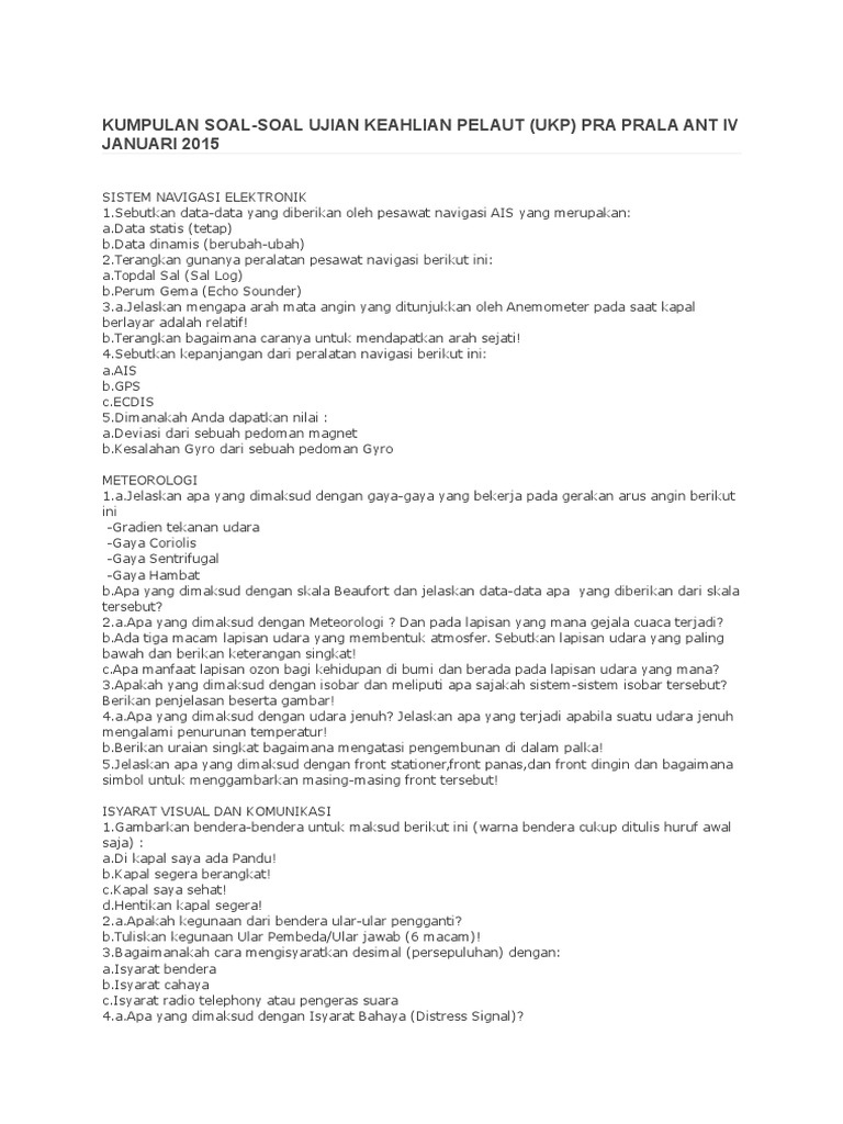 Kumpulan soal ukp cba pra prala nautika contribute to the safety of personnel and ship written by dya. The Mariners Handbook NP100 - Review in Bahasa Latihan Soal Fungsi 3 - UKP Pasca ANT III SS Soal n. Soal jawab perawatan permesinan kapal ukp pra prala att iii 1.